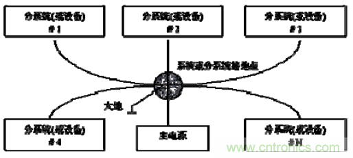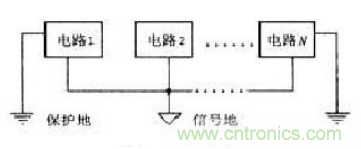 单点接地连接是指在产品的设计中,接地线路与单独一个参考点相连,该点常常以地球为参考,如图所示。