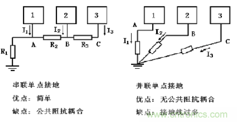 接地没有一个很系统的理论或模型,人们在考虑接地时只能依靠他过去的经验或从书上看到的经验。接地的方法很多,具体使用那一种方法取决于系统的结构和功能。接地的方式可以分为三种:单点接地,多点接地和混合接地。其中单点接地可以分为串联单点接地和并联单点接地两种,如图所示。
