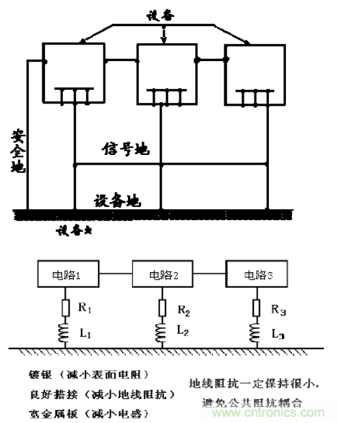 多点接地时容易产生公共阻抗耦合问题。在低频的场合,通过单点接地可以解决这个问题。但在高频时,只能通过减小地线阻抗(减小公共阻抗)来解决。在导体表面镀银能够降低导体的电阻,如图所示。