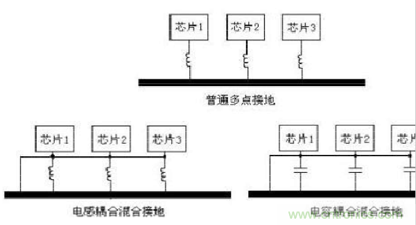 工作频率高(>30MHz)的采用多点接地式(即在该电路系统中,用一块接地平板代替电路中每部分各自的地回路),为了减小电感,要求地线的长度尽量短,在频率很高的系统中,通常接地线要控制在几毫米的范围内。每根接地线的长度小于信号波长的1/20。