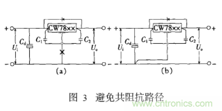 电源线的布置要根据电流的大小尽量加粗走线宽度。在布线工作的最后,用地线将电路板没有走线的地方铺满(大面积) 。在接地时还需要避免共阻抗路径,如图8-10所示稳压器电路的“调整端的取样点”或“公共点”,千万不能接在有负载电流流过的输出线和公共地线上如图(a)所示,应从管脚’根部’单独另外用引线引出如图(b)所示。