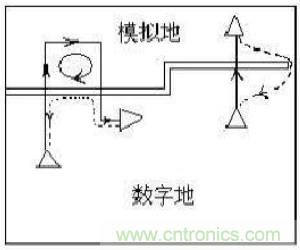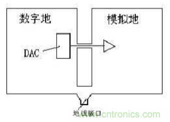 接地技术中还有一个很重要的部分就是数字电路与模拟电路的共地处理。一般说来,数字电路的频率高,而模拟电路的对噪声的敏感度强,正因为如此,高频的数字信号线要尽可能远离敏感的模拟电路器件,同样,彼此的信号回路也要相互隔离,这就牵涉到模拟和数字地的划分问题。一般的做法是,模拟地和数字地分离,只在某一点连接,这一点通常是在PCB板总的地线接口处,或者在数模转换器的下方,必要时可以使用磁性元件(如磁珠)连接,如图所示。