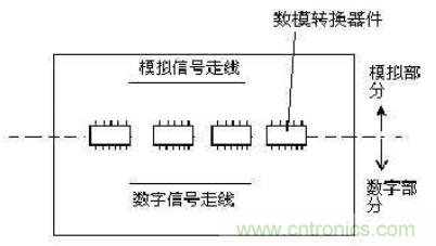 另外,也有一种统一地的处理方法,也就是不进行地分割,但规定各自的范围,保证数字和模拟走线及回流不会经过对方的区域。这种策略一般实用于数模器件比例相当,并存在多个数模转换器件的情况,有利于降低地平面的阻抗,参考地线设计如图8-13所示: