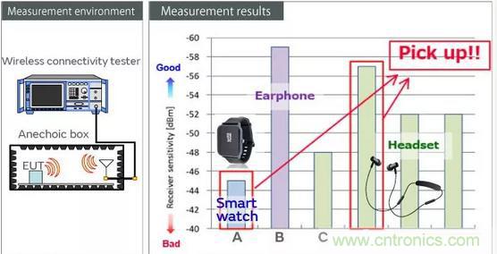 在许多内部耳机干扰的情况下,设备内的不需要的无线电波叠加在通信所需的信号之上,这会产生噪声并导致音频跳过。在这里,我们使用商业产品来测量2.4 GHz信号的最小接收电平,以验证由于设计对策而导致音频跳过的可能性的差异,以防止蓝牙设备内的干扰。就内部设备干扰而言,大图值表示即使信号较弱也可以进行通信,并且音频不太可能跳过。