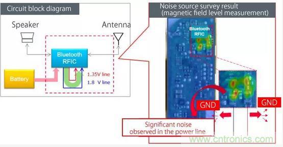 图4的右侧显示了频率固定为2.4 GHz时磁场分布强度的结果。红色区域表示强磁场,这表明在DC-DC转换器电路区域中具有特别高的磁场强度的蓝牙RF-IC将是用于噪声抑制的有效位置。