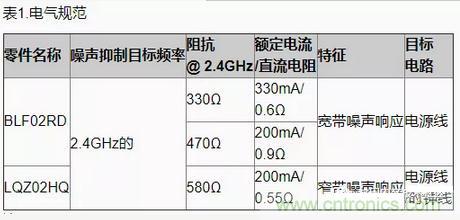 表1和图6显示了在这种情况下用于噪声抑制的BLF02RD和LQZ02HQ滤波器的代表性电气规范和插入损耗频率特性。