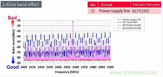 这些是在蓝牙通信期间测量与天线耦合的噪声频谱的结果。将BLF02RD过滤器插入电源线。我们能够将窄带噪声提高约5 dB,并验证BLF02RD滤波器是一种有效的解决方案。