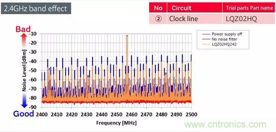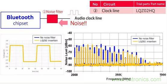 第一个区域是电源线,第二个区域是时钟线。由于电源线由于切换而产生更高的谐波,并且时钟信号的高次谐波延伸到2.4GHz频带,因此在蓝牙信号中产生噪声。滤波是抑制噪声传导的有效方法。