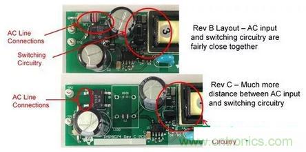 2. 查看电源中的寄生电容。我们都记得物理课上讲过,两个导体之间的电容与导体表面积成正比,与二者之间的距离成反比。查看电路中的每个节点,并特别注意具有高 dV/dt 的节点。想想电路布局中该节点的表面积是多少,节点距离电路板输入线路有多远???MOSFET 的漏极和缓冲电路是常见的罪魁祸首。