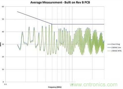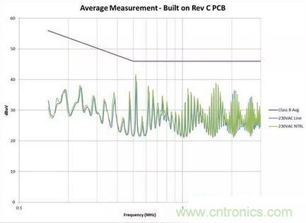 我通过简单调整电路板(无电路变化),将噪声降低了大约 6dB。见图 2 和图 3 的测量结果。在有些情况下,接近高 dV/dt 进行输入线路布线甚至还可击坏共模线圈 (CMC)。