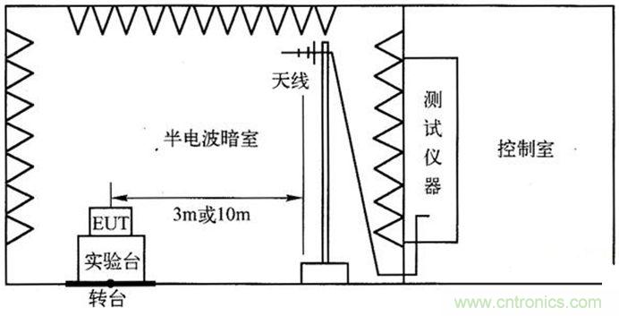 图1所示是根据CISPR16、CISPR11、CISPR13、CISPR15、CISPR22及EN55022等标准要求的辐射发射测试布置图,辐射发射测试时,被测设备(EUT)置于半电波暗室内部,在转台上旋转,在接收天线分别处于垂直极化和水平极化的情况下,找到最大的辐射点。辐射信号由接收天线接收后,通过电缆传到半电波暗室外的接收机。
