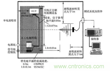对于汽车电子设备的辐射发射测试,CISPR25标准要求的辐射发射测试布置如图4所示。辐射发射测试时,汽车电子被测设各(EUT)置于半电波暗室内部,在接收天线距离EUT线束为1m,并分别在接收天线处于垂直极化和水平极化的情况下,找到最大的辐射点辐射信号由接收天线接收后,通过电缆传到半电波暗室外的接收机。