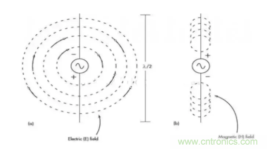 图1展示了典型的半波偶极子天线是如何产生电场和磁场的。转发后的信号被调制为正弦波,电压呈极性变化,因此在天线的各元件间生成了电场,极性每半个周期变换一次。天线元件的电流产生磁场,方向每半个周期变换一次。电磁场互为直角正交。