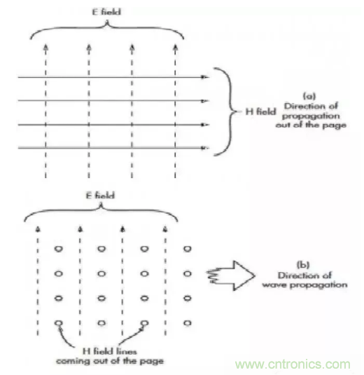 距离天线一定范围内,电场和磁场基本为平面并以直角相交。注意传播方向和电磁场均成直角。在图2(a)中,传播方向和电磁场线方向成正交,即垂直纸面向内或向外。在图2(b)中,磁场线垂直纸面向外,如图中圆圈所示。