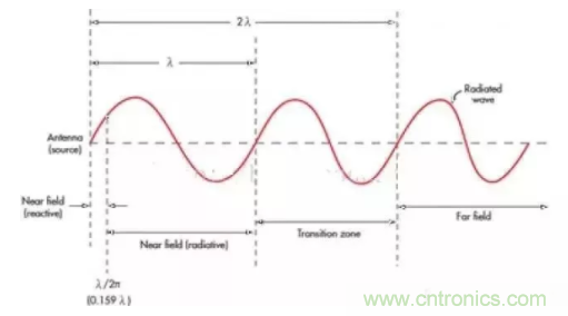 图3标出了辐射出的正弦波和近场、远场。近场通常分为两个区域,反应区和辐射区。在反应区里,电场和磁场是最强的,并且可以单独测量。根据天线的种类,某一种场会成为主导。例如环形天线主要是磁场,环形天线就如同变压器的初级,因为它产生的磁场很大。
