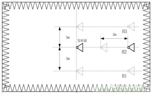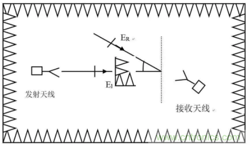 测试近场工作区反射电平时,发射天线先置于暗室中心轴线上,接收天线置于正对被测墙壁的一个合理位置,并沿两天线轴线移动一段距离进行反射电平的测试。测试位置如图所示。