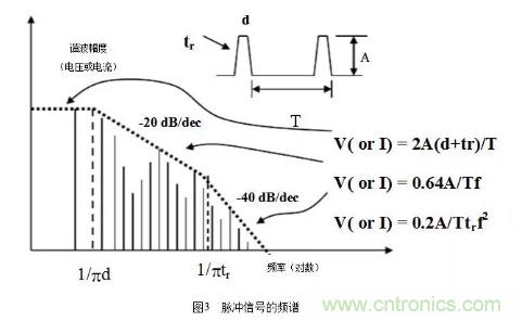 在EMC中,除了基本频率外,还需考虑谐波因素,通常取十倍频,但在数字电路中却有些不同,比如在时钟电路和逻辑门电路中,辐射带宽与数字信号的上升沿或下降沿有关系,而不是数字信号的重复周期,其关系为:rtF?/1max?,其中rt是脉冲的上升沿时间。例如,典型时钟驱动的边沿速率是2ns,此时,maxF≈160MHz,再考虑十倍频,则此时钟电路可能产生直到1.6GHz的辐射带宽。所以在选择器件时要选择慢速的逻辑器件系列,因为器件对电磁辐射贡献的大小与工作频率无直接关系而只取决于边沿速率(这和从电路功能设计上选择快速器件是矛盾的,在电路设计时需要折中考虑)?;褂写悠骷目谷拍芰ι侠此?,CMOS器件是最好的,因为它的噪声容限高。从封装上来说,BGA是最好的,因为它的引线很短。脉冲信号的频谱如图3所示。
