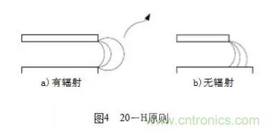(1)20-H原则,决定印制线条间的距离,表述如下:所有的具有一定电压的PCB都会向空间辐射电磁能量(如图4a),为减小这个效应,PCB的物理尺寸都应该比最靠近的接地板的物理尺寸小20H(其中H是两层PCB的间距),即3mm左右,这样可使辐射强度下降70%(如图4b)。20-H原则示意图如图4所示:
