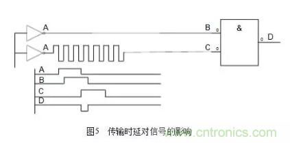 (3)保证信号在PCB上可靠的传输,确保信号的完整性。这里面主要的问题一般包括时延、阻抗不匹配、地弹跳、串音等。这不但影响到电子器件的稳定工作,还会产生电磁干扰。一般在高速逻辑设计中最容易碰到时延问题,处理不好会产生不希望的脉冲干扰。传输时延对信号的影响如图5所示。