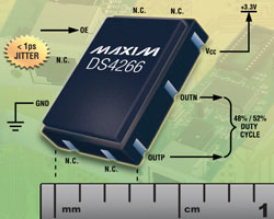 DS4266支持LVPECL和LVDS输出。器件工作在-40°C至+85°C扩展级温度范围,提供节省空间的5.0mm x 3.2mm x 1.49mm、10引脚LCCC表贴陶瓷封装。芯片起价为$4.50 (10,000片起,美国离岸价)。可提供样品以加速设计进程。