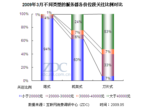 (图)2009年3月不同类型的服务器各价位段关注比例对比