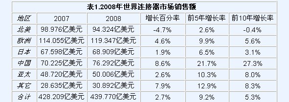 欧洲仍保持了世界连接器销售额最大的地区的地位,2008年达119.055亿美元,年增率达4.6%,过去5年的复合年增率高达9.9%,自2003以来连续6年保持增长。