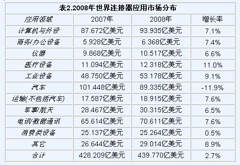 专业的连接器市场研究公司-Bishop&Associates于2009年4月公布了2008年世界连接器工业市场数据,数据显示受世界经济?;耐侠?,2008年世界连接器工业销售增幅急剧下滑,与上一年相比,仅增长2.7%,而2007年的增幅为7.2%,尽管如此,连接器工业仍然实现了6年的连续增长(2003 年11.2%, 2004年17.9%,2005年6.2%,2006年12.6%,2007年7.2%,2008年2.7%),与经济?;缕渌缱釉骷毡楦涸龀さ脑愀獗硐窒啾?,这一增长数字,是令人欣慰的。