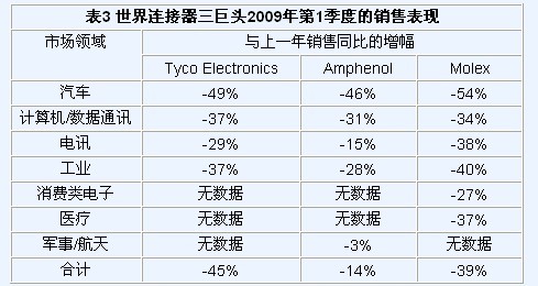 2009年第一季度已经过去,连接器产品订单剧降41.7%,销售则下挫了35.7%,这两项数据结果均创下了连接器工业的历史新低。在上一次表现最糟糕的2002年第四季度,销售和定单下降了31.2%。所有最终应用市场均报告直线下降,一片萧条迹象。三家世界最大的连接器公司泰科电子(Tyco Electronics)、安费诺(Amphenol)和莫列克斯(Molex)也均报告与上一年同比销售严重下降,如下表3所示。