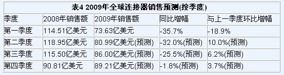 业界一致的看法是2009年连接器销售额将下降25%左右。假定在今年后三个季度内,行业实现环比增长,则预测如果如表4所示。如此推算,世界连接器市场需到2009年第四季度或2010年第一季度才能再实现年度同比增长。