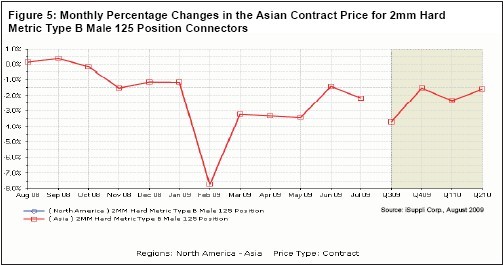 iSuppli公司认为,第二季度订单比第一季度增长15-16%,出货量增长7-9%。这种趋势与其它商品市场一致。但是,连接器领域补充库存的势头不太强。图5所示为亚洲每月连接器合同价格的百分比变动率,以代表市场趋势的未来四个季度预测。