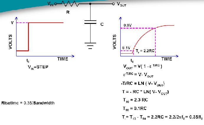 至此,我们知道带宽f2即输出电压降低到输入电压70.7%时的频率点。 根据放大器的等效模型,我们可进一步推导示波器的上升时间和带宽的关系式,即我们常提到的0.35的关系:上升时间=0.35/带宽,推导过程如下图6所示。 需要说明的是,0.35是基于高斯响应的理论值,实际测量系统中这个数值往往介于0.35-0.45之间。在示波器的datasheet上都会标明“上升时间”指标。 示波器测量出来的上升时间与真实的上升时间之间存在下面的关系式。 在对快沿信号测试中,需要通过该关系式来修正实际被测信号的上升时间。