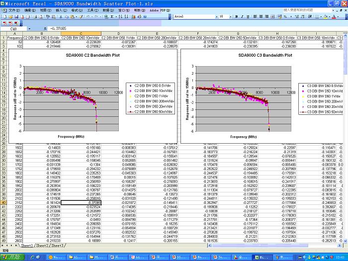 此外,在计量波特图时需要对示波器每个档位都进行计量,最终产生的波特图是所有档位的结果叠加在一起的。波特图的计量是需要半天时间完成的,并不是想象中那么轻松的工作。如图8所示是力科SDA9000的波特图,我特地将Excel中大量数据显示给大家以使大家对校准的严谨性有深刻认识。 其垂直轴是-1dB/div, 叠加了10mv/div、20mv/div、50mv/div、200mv/div、500mv/div、1v/div等档位的测试结果。 很多时候,我们的竞争对手会把他们的波特图画成-10dB/div、只有一个档位的测试结果拿给客户,并和力科提供的这种-1dB/div、各种档位叠在一起显示的结果放在一起进行对比,然后他们告诉客户,他们的波特图更平坦,更干净,甚至将力科波特图上面密密麻麻的点说成是“噪音”大。这是有点贻笑天下的。 竞争对手敢于一再采用这种做法,这是假设中国的工程师都没有辨别力,独立思考能力,是对工程师严重不尊重的公然欺骗行为。希望能引起大家注意。