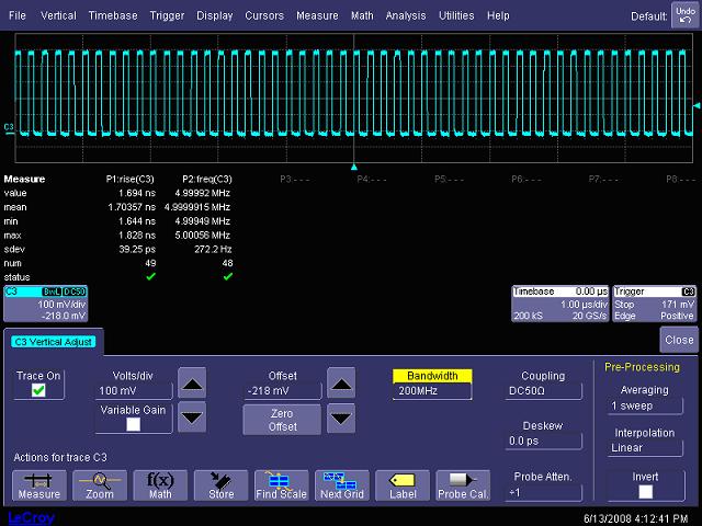 图14,带宽限制到200MHz时测量5MHz时钟上升时间