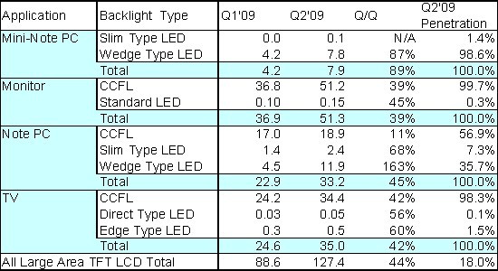 - LED背光源面板在2009年Q2出货量达2千300万片,较上一季度大幅成长116%