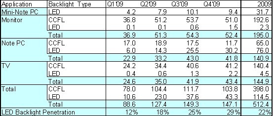 从应用别来看有1千430万片用在笔记本电脑上,790万片用在上网本上,60万片用在电视上,而有10万片用在桌上型显示器上。由以下表一显示2009年第二季 LED背光源面板在各种不同的应用中的渗透率,上网本全数使用LED背光源面板,渗透率为100%;而LED背光源面板占笔记本电脑面板的渗透率为43%,在液晶电视面板的渗透率仅2%,桌上型显示器面板的渗透率仅0.3%。