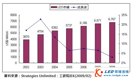 由于需求减缓,难以消耗年初所扩增产能,导致产品单价巨幅的向下变动,整体市场景气由繁荣转为衰退,所幸上半年市场成长,抵销部分下半年市场衰退负面影响,2008年全球LED市场较2007年微幅成长3%,达67.6亿美元,详如图一所示。