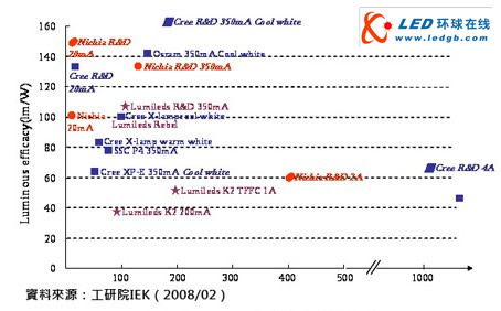 2001年标准型白光LED(20mA)发光效率仅25lm/W,至2009年初Nichia发表之白光LED,在20mA电流下,其发光效率可达249lm/W,为目前业界之最。高功率白光LED(350mA)发光效率也由2004年约30 lm/W,截至2008年年底Cree发表161lm/W产品为业界之最。