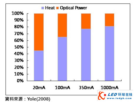 LED发光效率除了影响到光通量输出,以及耗能外,「热」另外一个重要关键,以目前普遍商品化LED发光效率分析(如图五),1W高功率LED发光效率约在70lm/W左右,其中有77%能量以热的型态表现出来,仅有23%能量以光的型态表现出来,当输入功率愈高,产生的热愈多,因此需要更多的散热组件,导致LED成本提高、可靠度降低,若能提高LED发光效率,LED散热问题自然可以解决。