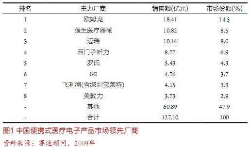 便携医疗产品和医疗信息化配套产品是目前国内嵌入式系统厂家切入医疗电子市场的亮点。赛迪顾问在深圳“2009中国国际医疗电子大会”上指出,除了迈瑞以外,国内本土的医疗器械生产厂家还很少,国外厂家还远远没有占领市场的多数份额,48%的市场还待开拓,国内医疗电子生产企业的机会很多(如图1)。