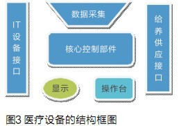 前面谈了许多关于国内嵌入式企业在发展医疗电子产品上的优势,但是,我们必须清醒地看到医疗电子产品(或者称为有源的医疗设备)设计的特殊性。一般来讲,医疗设备由下面几个部分组成:电子控制部分、显示和操作台、给养供应和数据采集、以及其他设备接口(包括IT等),如图3。每个部分都可能有独立的MCU或者ASIC/FPGA,甚至是高性能的嵌入式计算机组成的多处理器系统。软件研发的费用在现代医疗设备研发费用中所占的比重已经超过50%,未来还会增加。医疗设备的特殊性体现在下面几个方面: