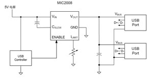 图7是一种输出限制电流可调节的USB端口电路。该电路由MIC2008作功率分配开关,由USB控制器对功率分配开关实现控制。限定的电流由外设电阻R来设定(限制电流范围为0.2~2.0A)。该功率分配开关的输出电压上升率(启动时间)可由外设电容C来设定,内部有过热?;ぜ笆淙氲缪构褪笔涑鏊姹;?。