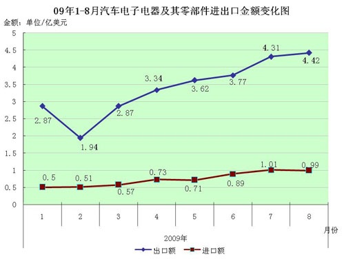 一、 2009年1-8月份国内汽车电子电器产品出口量一路上扬