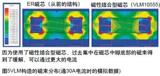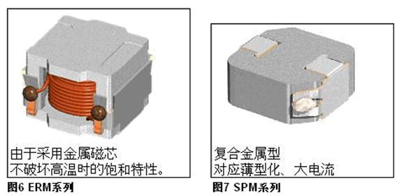 一直以来,一般的电感是以Ni-Zn系的铁氧体作为磁芯的,这种材料虽然强度较高,但是饱和磁束密度较低,高温时,饱和磁束密度会降低,在电子部件驱动日趋低电压,大电流化的今日,这类小型化产品无法对应大电流。要在高温环境下通过更大的电流,就要使用由饱和磁束密度高且损耗小的Mn-Zn铁氧体磁芯构成的电感。一般而言,Mn-Zn铁氧体材料的电感,磁芯的中脚部分会形成Gap,磁芯的中脚部分开始较容易饱和。如图4 VLM所示,结构是由口字形磁芯(磁性结合型磁芯)和棒状磁芯组成。采用了这种构造后,将本来容易产生饱和的中心磁芯的中脚部分分成上下两部分,在上下根部形成Gap,不易出现部分饱和,能够容许更大电流通过。另外,由于Gap分散在卷线的上下两端,可以减少从Gap泄漏的磁束对卷线的影响。过电流损失减少,电源效率也提高了。再者,还可使用金属磁芯的电感。它的饱和磁束密度更高,受温度影响饱和电流的变化很少。如图6 ERM6050所示。金属磁芯的电感还有另外一款复合金属型的电感(图7 SPM系列)。