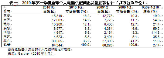 据Gartner发布的初步统计结果,2010年第一季度全球个人电脑出货量已达到8,430万台,与2009年同期相比增长27.4%,这一结果超过了Gartner此前所作的22%的增长预测。