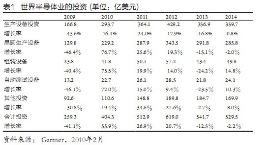 近期半导体业的迅猛增长,推动了半导体生产设备市场的快速复苏,存储器、代工业的发展以及进一步走向微细化先进技术的要求,则是主要的拉动力量。在各项生产设备中晶圆生产线(wafer fab)设备最为重要,增长也最快,2010年将窜升76.7%,达229亿美元,独占半导体生产设备的78%,整个半导体业投资的近57%。组装设备增长75.5%,达41.8亿美元,自动测试设备增长72%,达22.7亿美元。其他有关投资增长19.4%,达110.6亿美元,整个半导体业投资共增长55.9%,达到404.3亿美元(表l)。