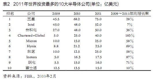 又据FBR市场调研公司发表的报告,世界半导体业的总投资额2009~2011年分别为257亿美元、406亿美元和495亿美元,和Gartner公司所报基本相同。该公司又称,这3年世界最大25家半导体公司的投资,占到整个半导体业投资的近90%。2009~2011年世界投资最多的l0家半导体公司如表2所示。