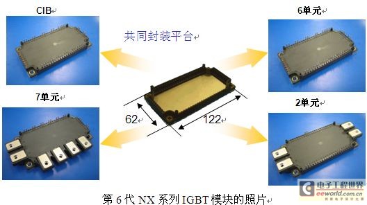 第6代NX系列IGBT??椴贩岣唬?200V和1700V两个电压等级,额定电流从35A到1000A,分别有CIB (Converter Inverter Brake)、七单元、六单元、二单元和一单元??椋?种电路拓扑。全系列产品采用同一封装平台从而降低了??榈闹圃斐杀?,使得NX系列IGBT??榈男约郾染哂胁煌俺5木赫Α?