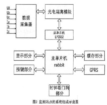 监测站点由前端数据采集器和现场下位机构成,其中前端数据采集器采用CS5460模块和LPC932单片机构成,它负责采集监控现场的各项数据并存储。线路的内部经过严格的电磁隔离,测量电路经过采样、A/D转换处理后形成的数字信号再经过光电耦合由信号适配器向从单片机LPC932传送,主单片机与从单片机之间可采用I/O口模拟时序的方式进行串口通信。
