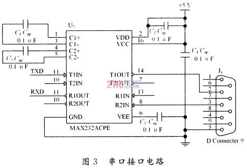 RS232标准是美国电子工业联合会(EIA)制定的一种串行物理接口标准,它适合于数据传输率在O~20000b/s范围内的通信,目前广泛用于计算机与终端或外设之间的近端连接。实际工作时,应保证电平在5~15V之间。所以为了与单片机进行通信。必须对其电平进行转换。现在常用的转换芯片是MAX232。MAX232内部有电压倍增电路和转换电路,只需5V电源便可实现TTL电平与RS232电平的转换,使用十分方便。串口接口电路如图3所示。