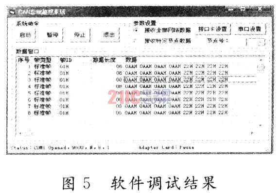 命令帧共6个字节,传输方向为PC机到单片机。以0X00H作为帧起始,数据长度为2,当数据1和数据2同为0X00时,表示启动接口卡,单片机接收到该信号后.会初始化SJA1000,并将结果反馈给PC机(成功或失败);当数据1和数据2同为0XFFH时,表示要求接口卡停止工作,单片机会让SJA1000进入睡眠模式,以退出总线;当数据1为0X01H时,表示PC机要求只接收某个节点的数据,数据2则表示该接点的节点号,单片机会重新设置SJA1000的验收滤波器,屏蔽掉其他不需要的节点数据。